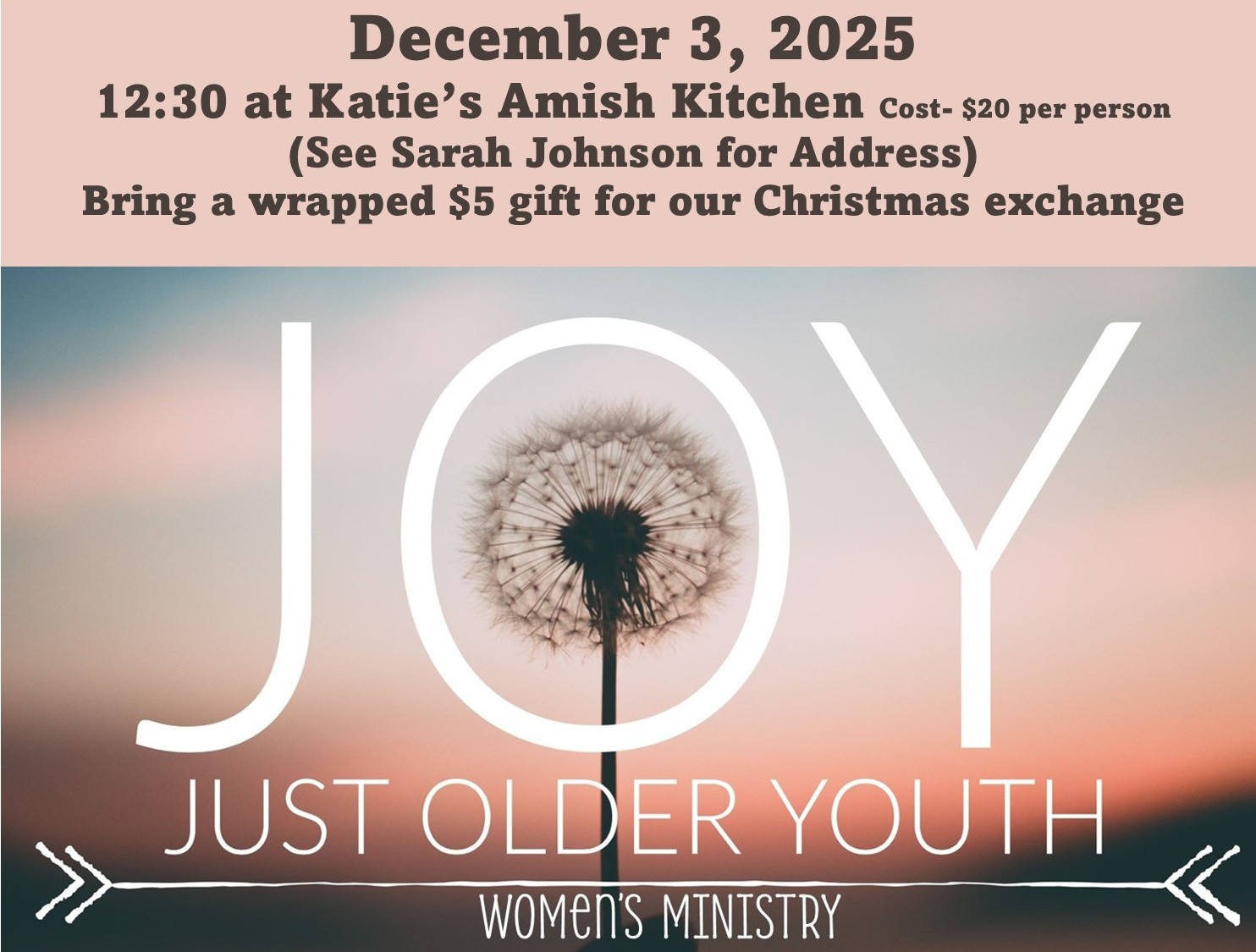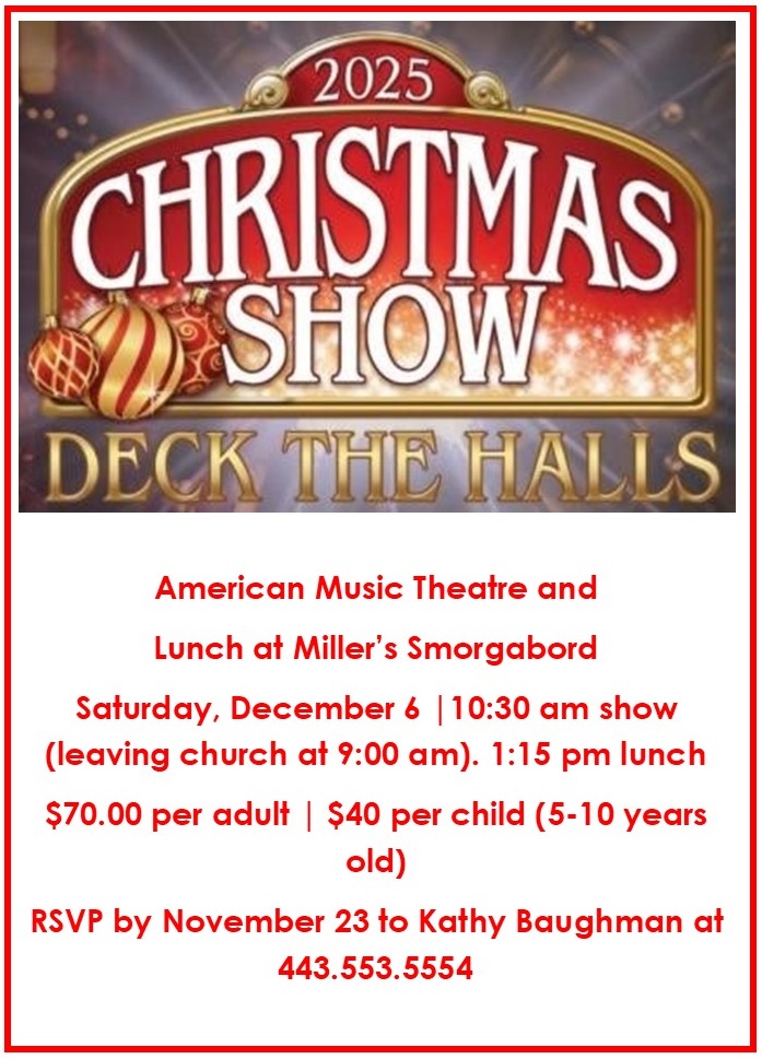 Ladies 55 and up, we are heading to Katie's house (in Rising Sun) on December 3rd for our Christmas JOY lunch. Cost is $20. See Sarah Johnson for address. Also, if you would like to participate in our Christmas gift exchange, please bring a $5 wrapped gift.